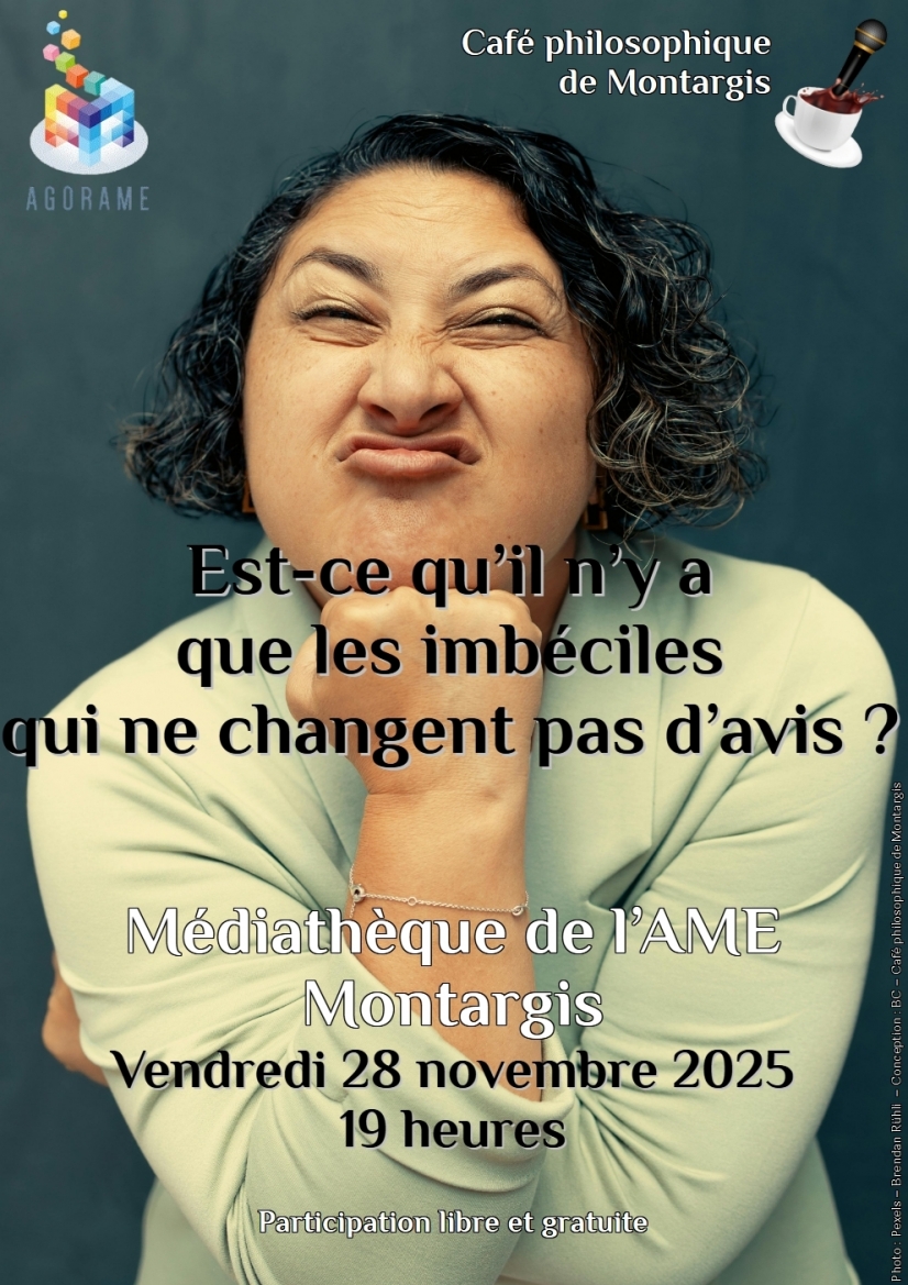 Le Café philosophique de Montargis proposera son prochain rendez-vous le vendredi 28 novembre prochain à la Médiathèque de Montargis, à 19 heures. Le sujet de la soirée portera sur cette question : "Est-ce qu’il n’y a que les imbéciles qui ne changent pas d’avis ?"